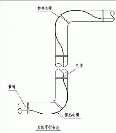4)直線平行安裝時,伴熱電纜應(yīng)沿彎頭凸面安裝,并在彎頭的兩端及中間作固定 |