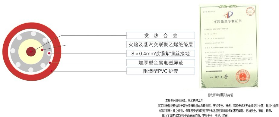 我司提供的一種畜牧養(yǎng)殖幼崽專用發(fā)熱電纜,包括有發(fā)熱合金,所述的發(fā)熱合金外依次包覆有塑料導(dǎo)體、氟隆絕緣層、火焰及蒸汽交聯(lián)聚乙烯絕緣層、鍍錫紫銅絲接地、加厚型金屬電磁屏蔽層、阻燃型PVC外護套和彈性橡膠軟套,所述的發(fā)熱合金和塑料導(dǎo)體融為一體,防止電打火的情況發(fā)生。